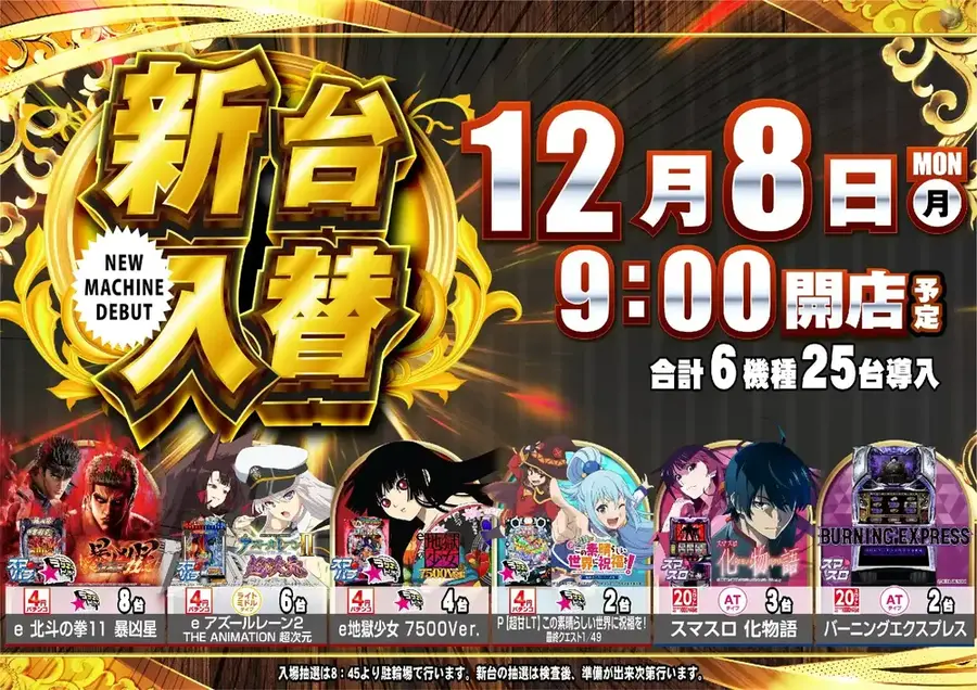 本日もダイナム相模原店のブログを閲覧いただき誠にありがとうございます。 12月8日新台入替予定!詳しくは記事をチェック!!!! |