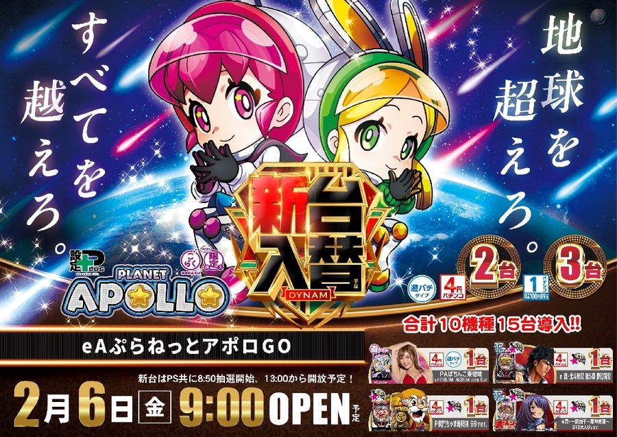 eAぷらねっとアポロ 2台 ※こちらの機種は1パチンコ(100円89玉)にも3台導入します。