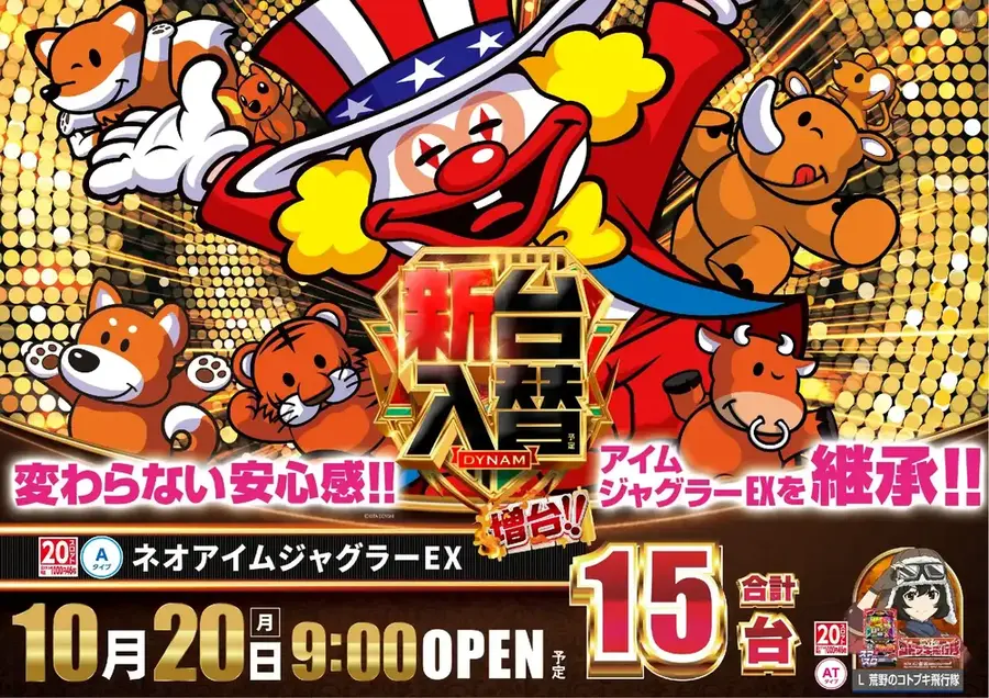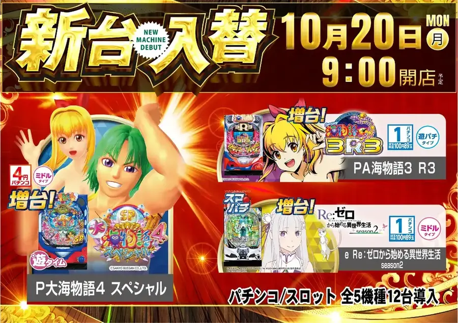 ダイナム二本松店より 10/20(月)新台入替のご案内 新 台 入 替予定 機種名をクリックすると、 機種情報が確認できます。 是非、お試しくださいませ。