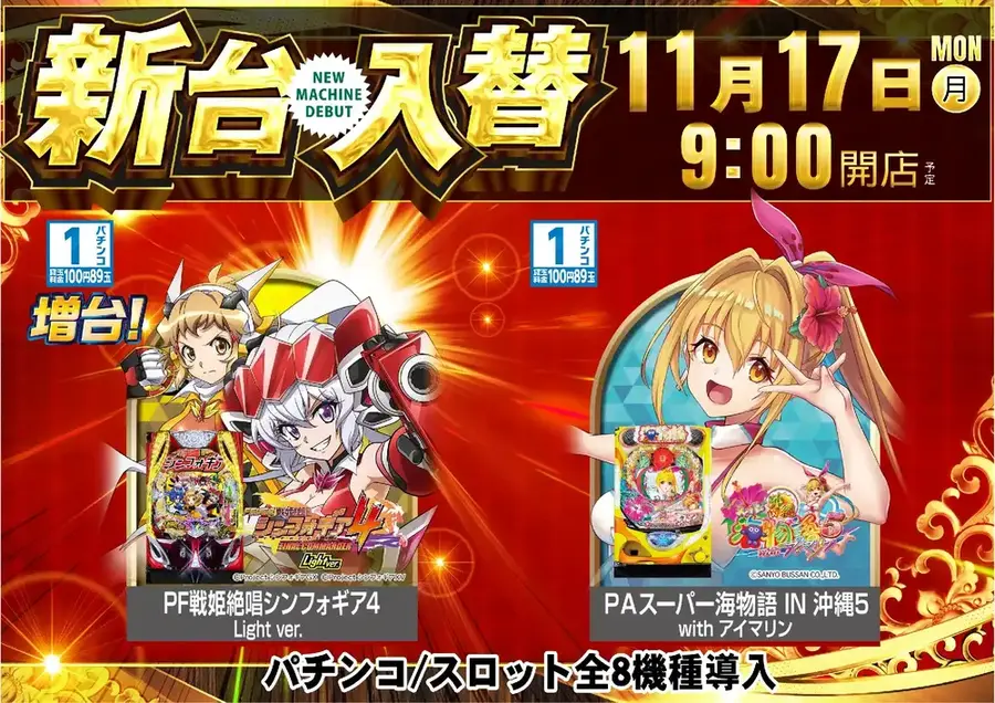 ダイナム二本松店より 11/17(月)新台入替のご案内 新 台 入 替予定 機種名をクリックすると、 機種情報が確認できます。 是非、お試しくださいませ。