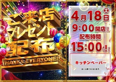 ■□■□■□■□■□■□■□ 4月18日(土) 朝9時OPEN!! ≪ご来店プレゼント≫ (総付景品配布) 15時~開始(予定) ■□■□■□■□■□■□■□ キッチンペーパー (お一人様1つになります) ■□■□■□■□■□■□■□ 従業員一同 心よりお待ちしております♪
