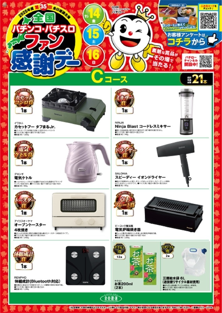 いつも当店のHPをご覧いただき 誠にありがありがとうございます♪♪ ★☆★☆★☆★☆★☆★☆★☆★☆★☆★☆ 第35回 パチンコ・パチスロファン感謝デー ★☆★☆★☆★☆★☆★☆★☆★☆★☆★☆ 11月14日(金) 11月15日(土) 11月16日(日) 3日間連続での開催です。 当選賞品は店内と写真でチェック!