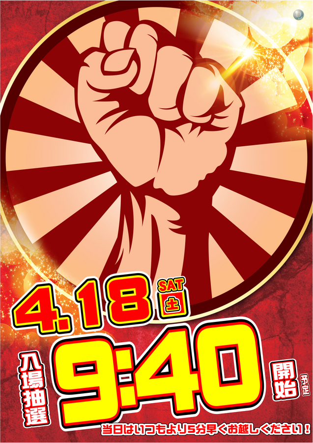 抽選方法や場所については変更ございません!従業員が9:30までには抽選場所にて待機しておりますのでお気軽にお尋ねください。多数様のご来店お待ちしております