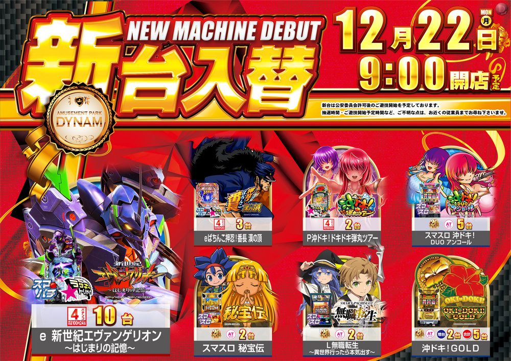上記2機種を含めパチンコスロット全7機種計26台を導入予定です。