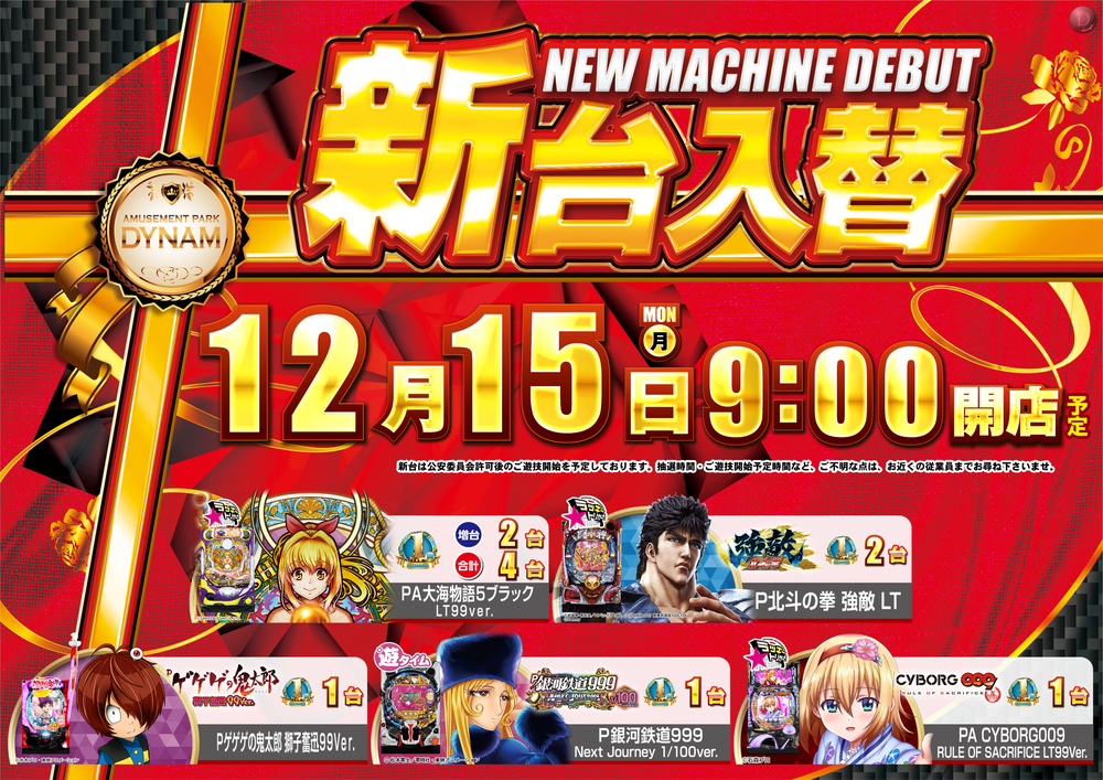 今週は1パチンコにPA大海物語5ブラック 2台増台、P北斗の拳 強敵 2台導入、その他3機種3台を導入しましたがお楽しみ頂けてますでしょうか♪