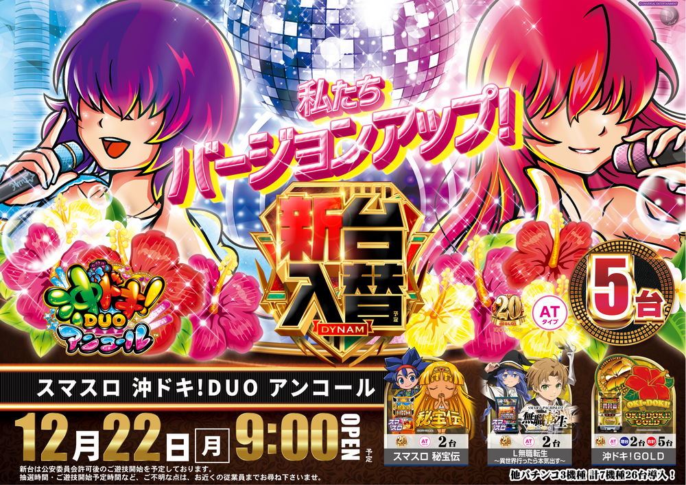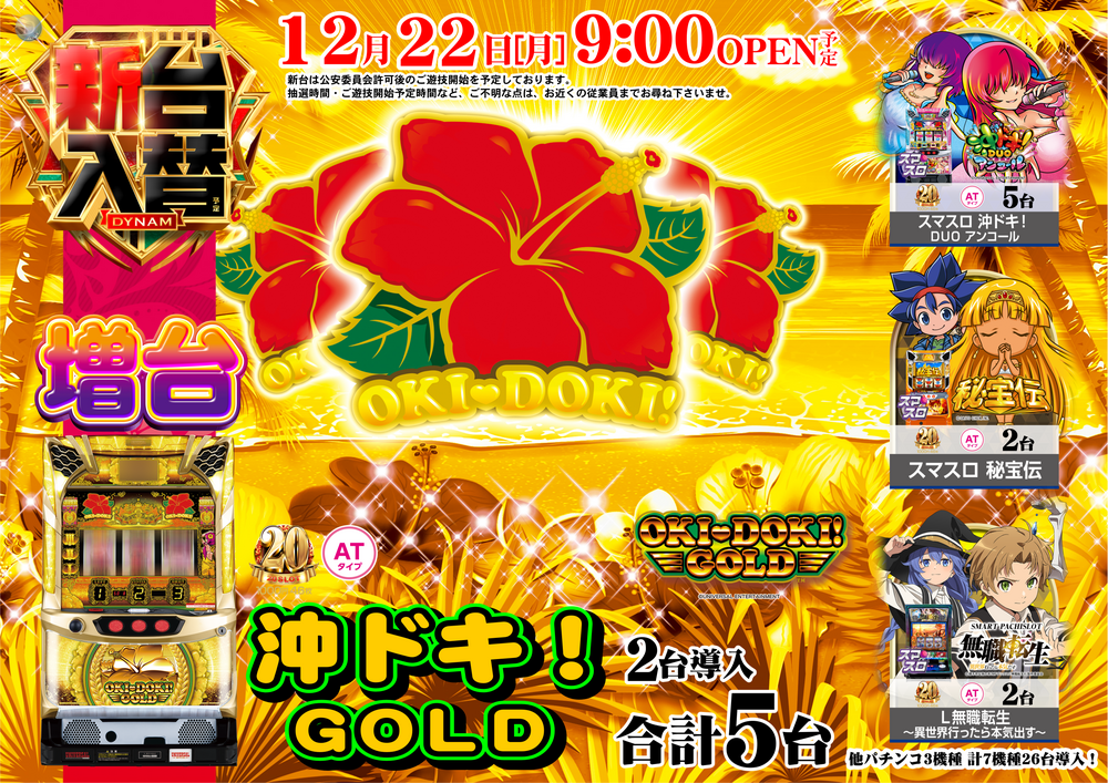 今週は12/22に「沖ドキ」シリーズ最新作の「スマスロ沖ドキDUOアンコール」5台を始め7機種26台の新台入替を行いましたがお楽しみ頂けてますでしょうか♪