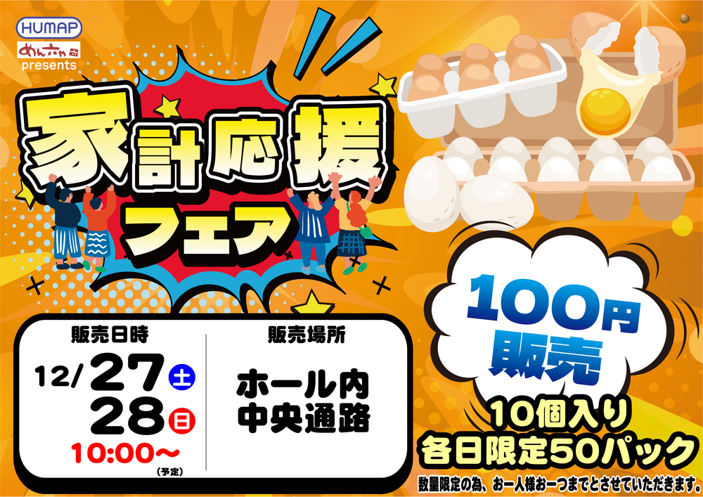 HUMAP・めん六やpresents 家計応援フェア たまご10個入り100円販売会 実施します!! (各日限定50パック お一人様1パック) 衝撃価格のたまごをゲット~~!! ホール内中央通路にて実施します♪