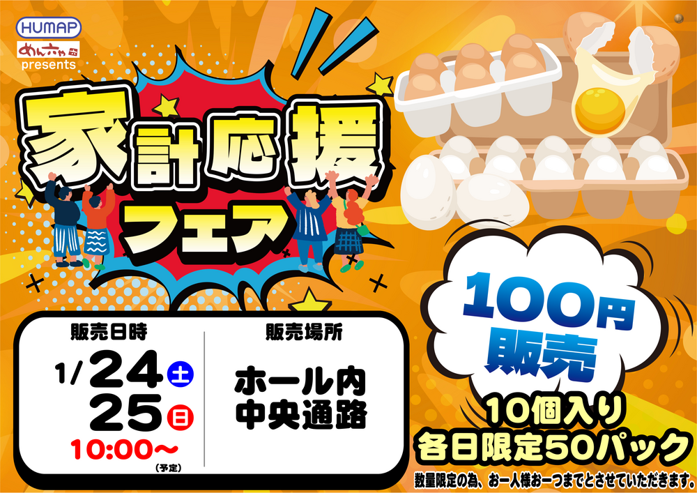 HUMAP・めん六やpresents 家計応援フェア たまご10個入り 100円販売会を 実施します!! (各日限定50パック お一人様1パック) 衝撃価格のたまごをゲット~~!! ホール内中央通路にて実施します♪