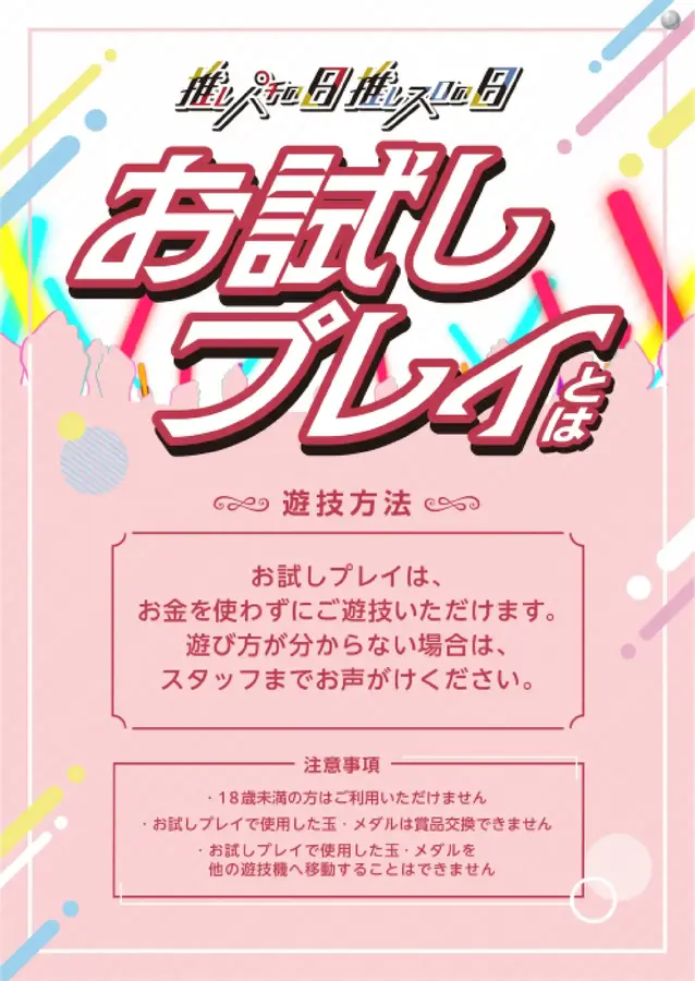 5月2日(土)3日(日)は お金をかけずに「お試しプレイ」ができます! 「お試しプレイ」設置機種 全19機種20台(予定) e ぷらねっとアポロ GO e 炎炎ノ消防隊2MS紅丸 e ブルーロック MZ e 東京リベンジャーズ GFEC e Re:ゼロseason2 M13 e 冴えない彼女の育て方 LX04 e 花の慶次~黄金の一撃 H4 e もののがたり F e Fからくりサーカス2 R