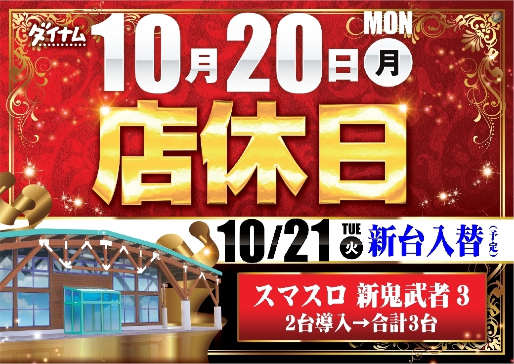 いつもダイナム神栖店のHPをご覧頂き、 誠にありがとうございます 10月21日(火) 新台入替 スマスロ 新鬼武者3増台!! 9時開店(予定) スマスロ 新... |