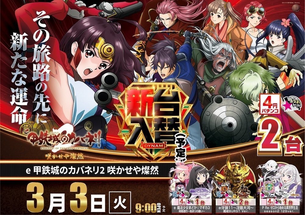 ☆4円パチンコ導入機種☆ e 甲鉄城のカバネリ2 咲かせや燦然 e 魔法少女まどか☆マギカ3 時間遡行~始まりの願い~ e牙狼11~冴島大河~魔戒BURST Ver. P Re:ゼロから始める異世界生活 season2 129ver.