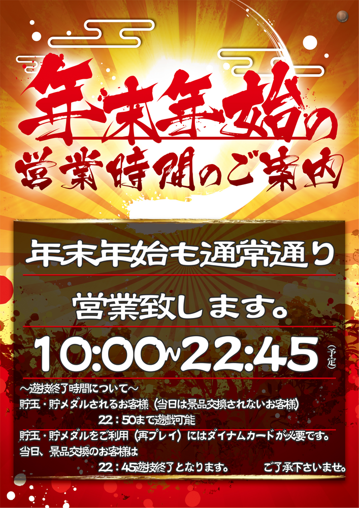 当日、景品交換のお客様は22:45遊技終了となります。ご了承くださいませ。