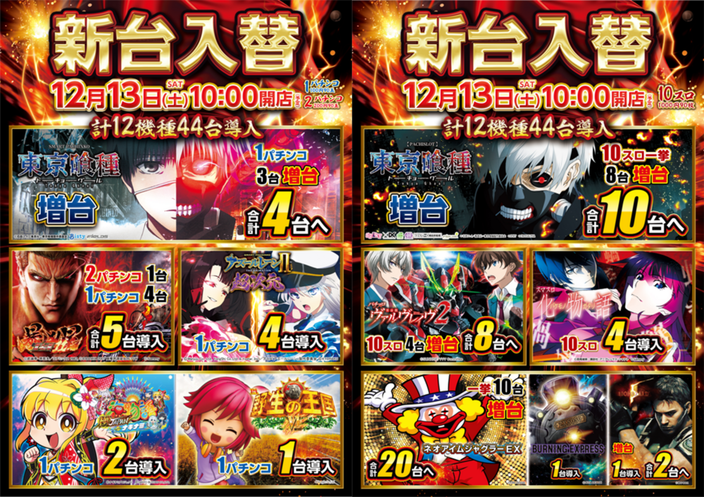 12/13(土)に新台入替済。スマパチ&スマスロ 東京喰種増台しております