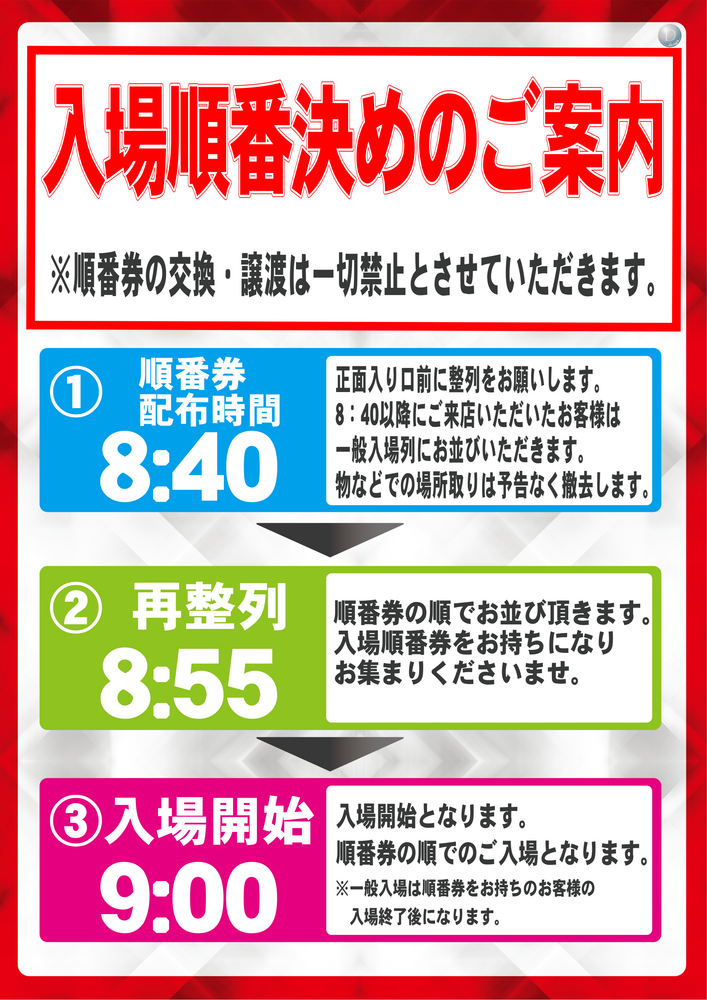 入場整理券(順不同)は8:40より店舗道路側出入口にて配布予定となります。