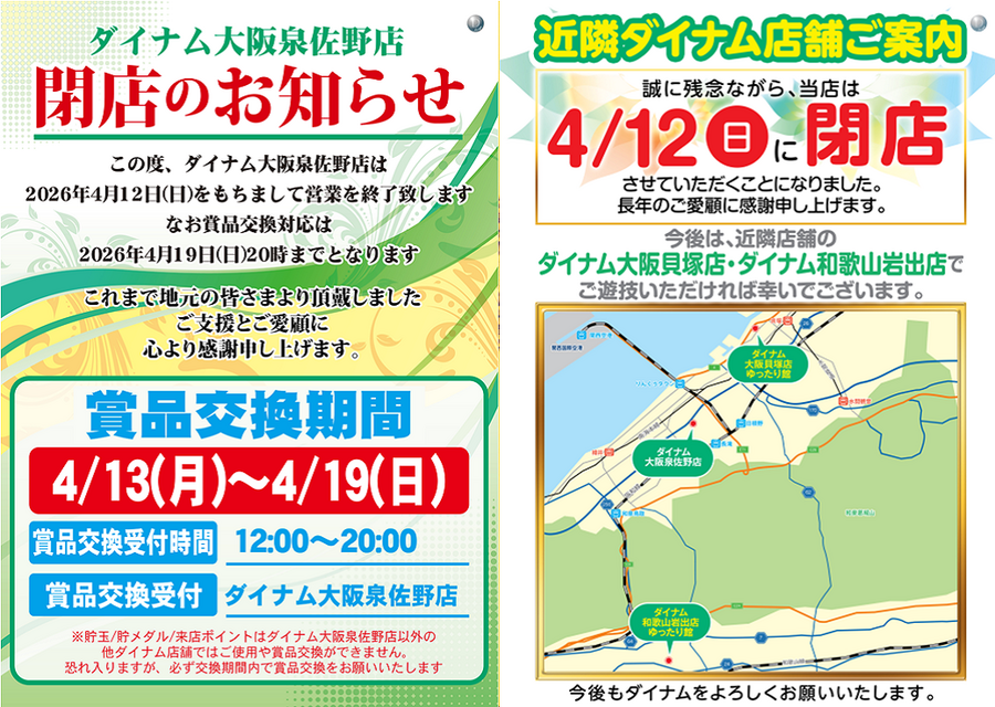 また、近隣のダイナム大阪貝塚店・ダイナム和歌山岩出店は通常通り営業しております。