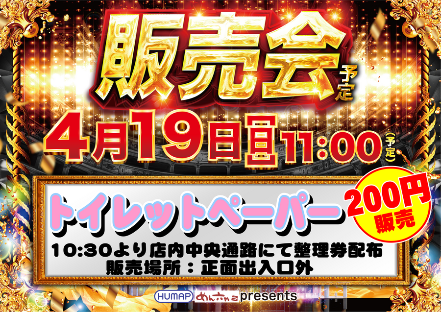 4/19(日)11:00~11:15(予定) 4月は新生活応援 お客様よりリクエストの トイレットぺーパーをご用意 販売のご案内 ①10:30~店内中央通路にて整理券配布 ②11:00~11:15の販売時間を過ぎた整理券は無効 ※整理券に余りがあった時は 販売時間を延長する場合があります お早めのご来店 お待ちしております