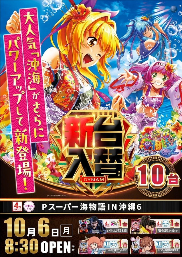 【4円パチンコ】 ☆Pスーパー海物語IN沖縄6(10台) ☆e ベルセルク無双 第2章(1台) ☆P真・花の慶次3~99ver.(1台)