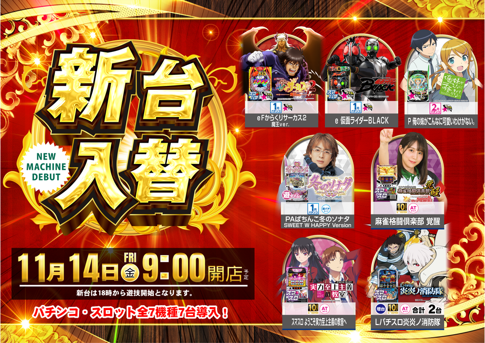 18時より遊技開始となります。 機種名をクリックすると詳しい機種情報が見れますよ