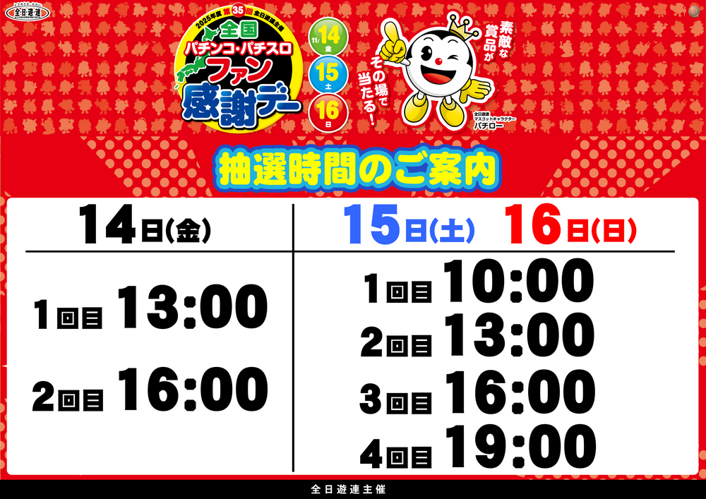 全国パチンコ・パチスロ ファン感謝デー 11月14日(金)・15日(土)・16日(日)の3日間開催いたします