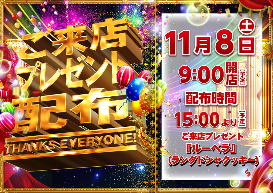 当日は【並び替え抽選開始時間8:40】となっておりますのでお早めにご来店くださいませ![]()