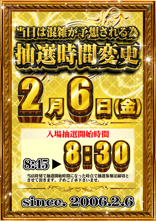 【重要】 2月6日(金) 入場抽選抽選時間変更のお知らせ |