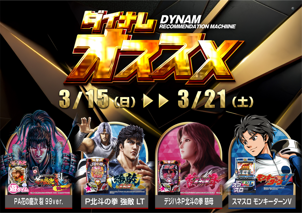 ”慶次裂””北斗強敵””北斗慈母””モンキーターン”を21(土)までオススメ中です