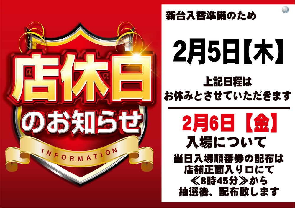 新台入替準備の為、誠に勝手ながら 店休日となっております.