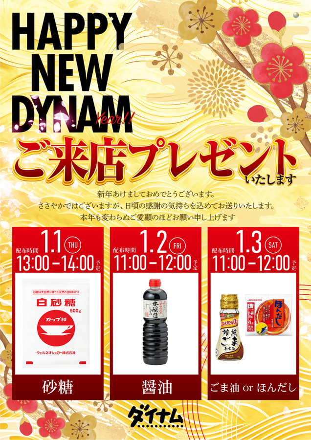 ◆◇◆◇◆◇◆◇◆◇◆◇◆◇◆◇◆◇◆◇◆◇◆◇◆◇◆ 1月1日(木)白砂糖 1月2日(金) 醤油 1月3日(土) ごま油 or ほんだし 総付景品配布 朝9:00開店(予定) ◆◇◆◇◆◇◆◇◆◇◆◇◆◇◆◇◆◇◆◇◆◇◆◇◆◇◆ 時間になりましたら従業員が配布に参りますので お席にてお待ち下さいませ。