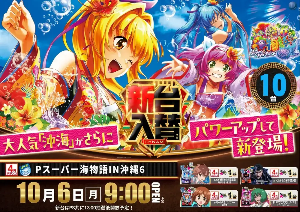 新台はPS共に13:00開放となります。 また、開放時間に新台をご遊技希望のお客様へは 抽選会を実施します あらかじめ、ご了承くださいませ