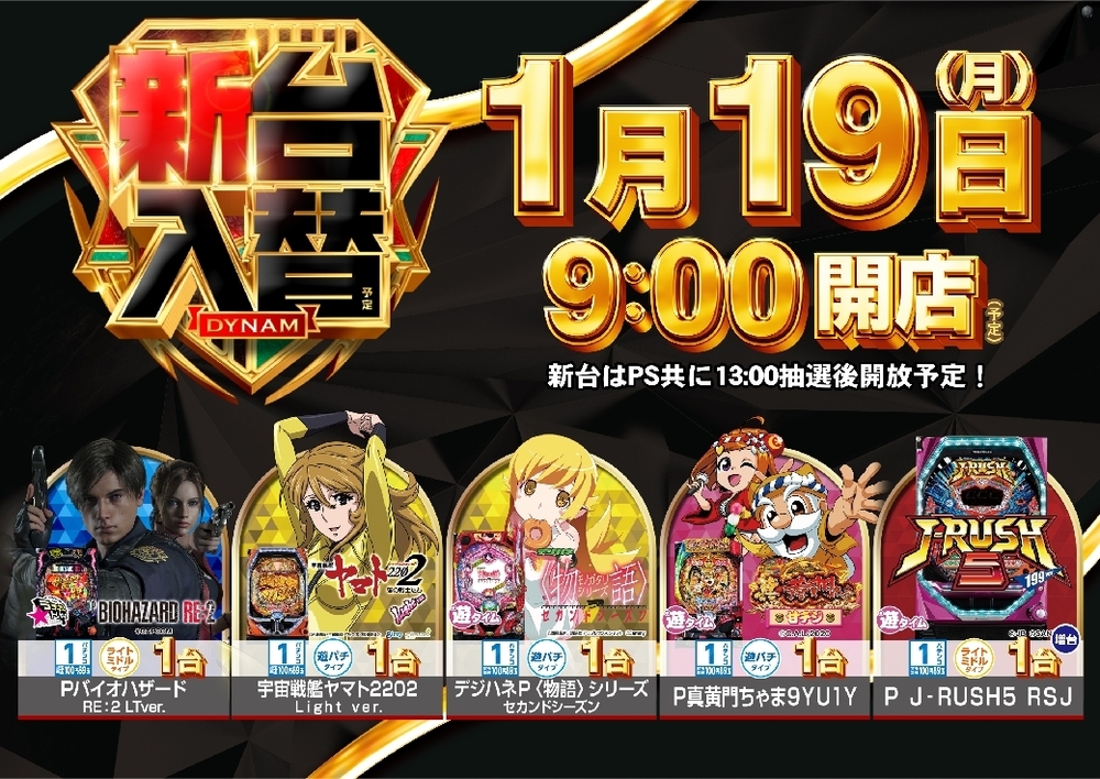 新台はPS共に13:00開放となります。 また、開放時間に新台をご遊技希望のお客様へは 抽選会を実施します あらかじめ、ご了承くださいませ