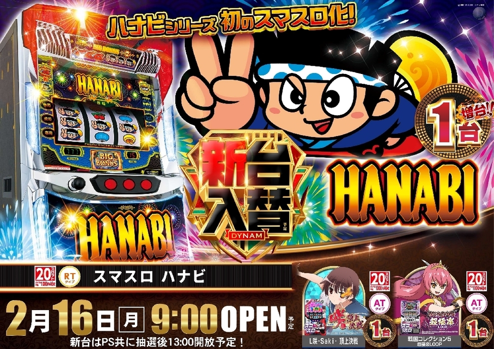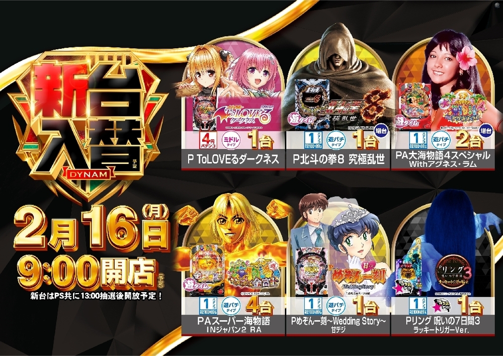 新台はPS共に13:00開放となります。 また、開放時間に新台をご遊技希望のお客様へは 抽選会を実施します あらかじめ、ご了承くださいませ