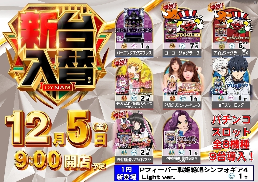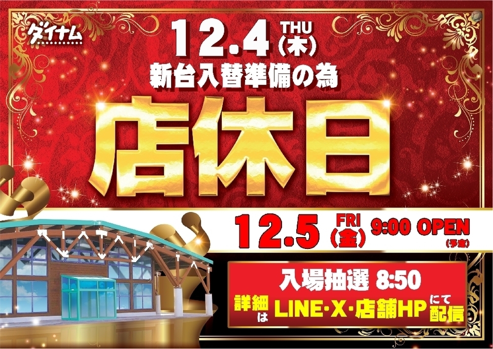 12月4日(木)は、新台入替準備の為、誠に勝手ではございますが