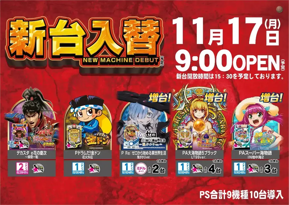遊技台のデータをはじめ、新台入替や新景品入荷、従業員ブログなど、