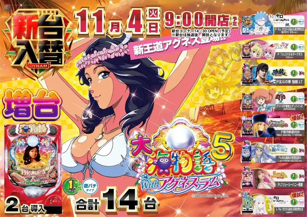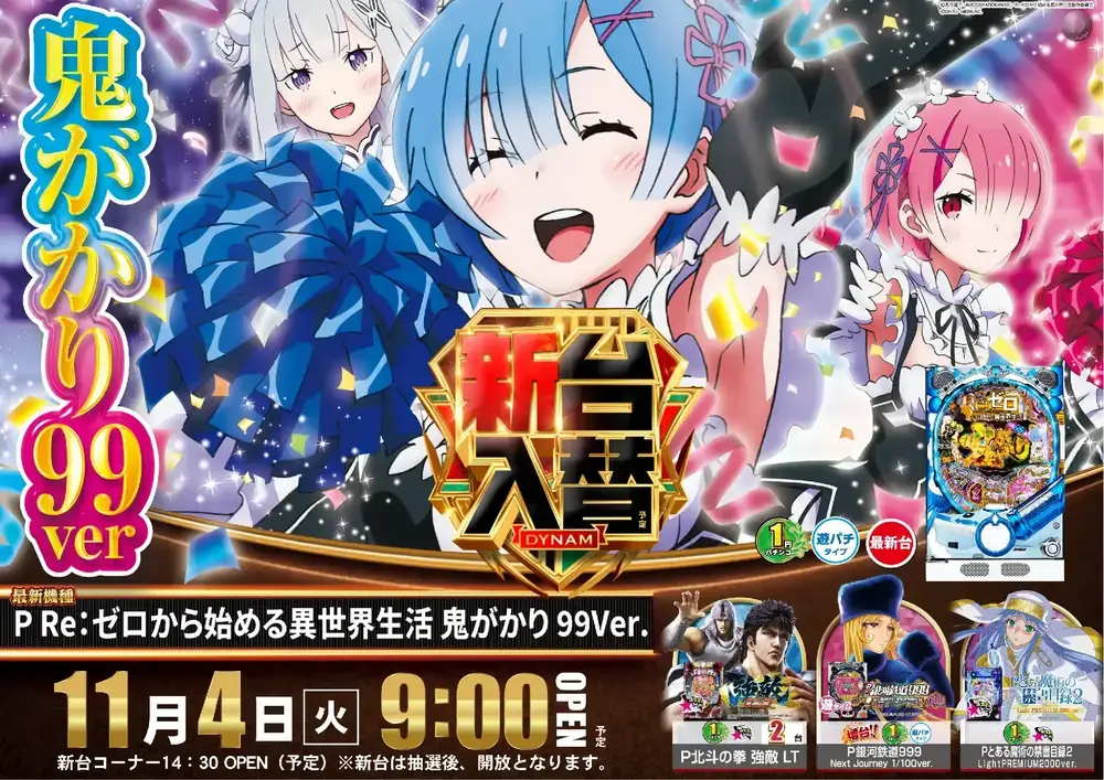 【1円パチンコ】 ◆PA大海物語5 Withアグネス・ラム ◆P Re:ゼロから始める異世界生活 鬼がかり 99ver. ◆P ToLOVEるダークネス 100ver. ◆P北斗の拳 強敵 LT ◆デジハネP聖戦士ダンバイン2 ZEROSONIC ◆P銀河鉄道999 Next Journey 1/100ver. ◆Pとある魔術の禁書目録2 LightPREMIUM2000ver. ◆PLTジューシーハニー極嬢 ◆e Re:ゼロから始める異世界生活 season2