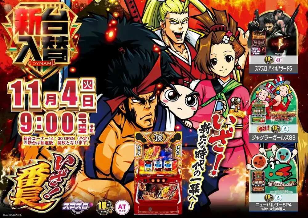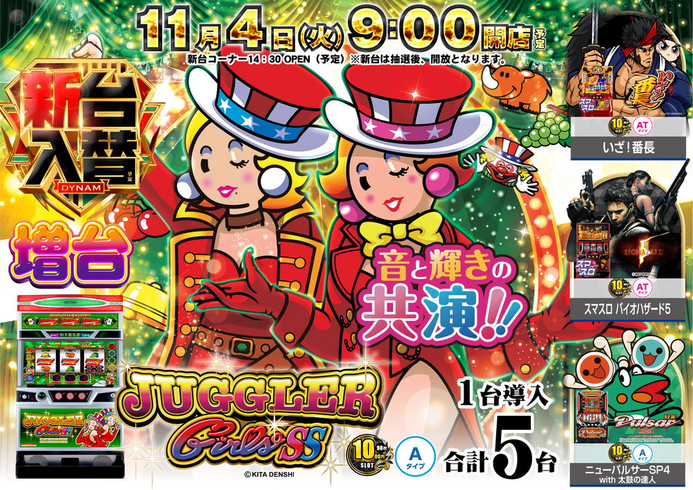 【1000円98枚スロット】 ◆いざ!番長 ◆スマスロ バイオハザード5 ◆ジャグラーガールズSS ◆ニューパルサーSP4 with 太鼓の達人