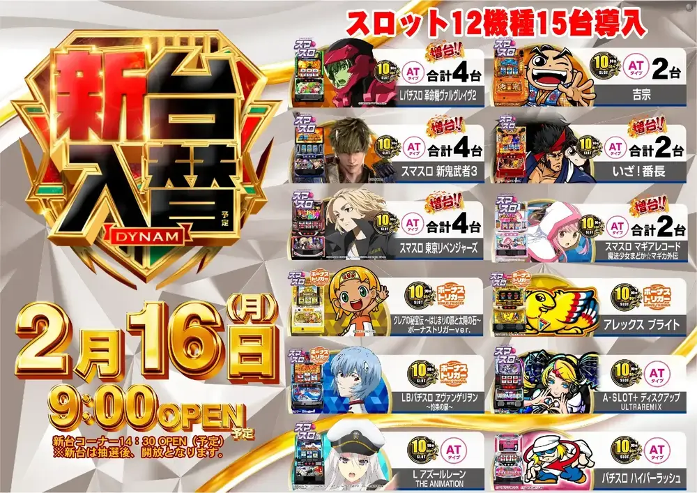 【1000円90枚スロット】 ◆Lパチスロ 革命機ヴァルヴレイヴ2 ◆吉宗 ◆スマスロ 新鬼武者3 ◆いざ!番長 ◆クレアの秘宝伝 ~はじまりの扉と太陽の石~ ボーナストリガーver. ◆スマスロ 東京リベンジャーズ ◆スマスロ マギアレコード 魔法少女まどか☆マギカ外伝 ◆アレックス ブライト ◆LBパチスロ ヱヴァンゲリヲン ~約束の扉~ ◆A‐SLOT+ ディスクアップ ULTRAREMIX ◆L アズールレーン THE ANIMATION ◆パチスロ ハイパーラッシュ