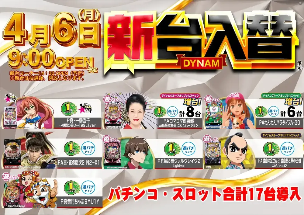 【1円パチンコ】 P真・一騎当千~桃園の誓い~199LTver. (ラッキートリガー搭載) PA真・花の慶次2 N2-X1 (遊パチタイプ) PAコマコマ倶楽部with坂本冬美 ごらくバージョン (遊パチタイプ) P真黄門ちゃま 9YU1Y (遊パチタイプ) PAわんわんパラダイスV-GO (遊パチタイプ) PF革命機ヴァルヴレイヴ2 Lightver. (遊パチタイプ) PA遠山の金さん2 遠山桜と華の密偵 ごらくバージョン (遊パチタイプ)