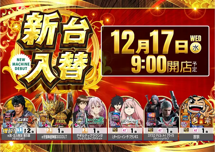 入替当日は朝9:00 OPEN(予定)となります。 8:45から正面入り口にて入場抽選を行いますので 是非あさからご来店ください