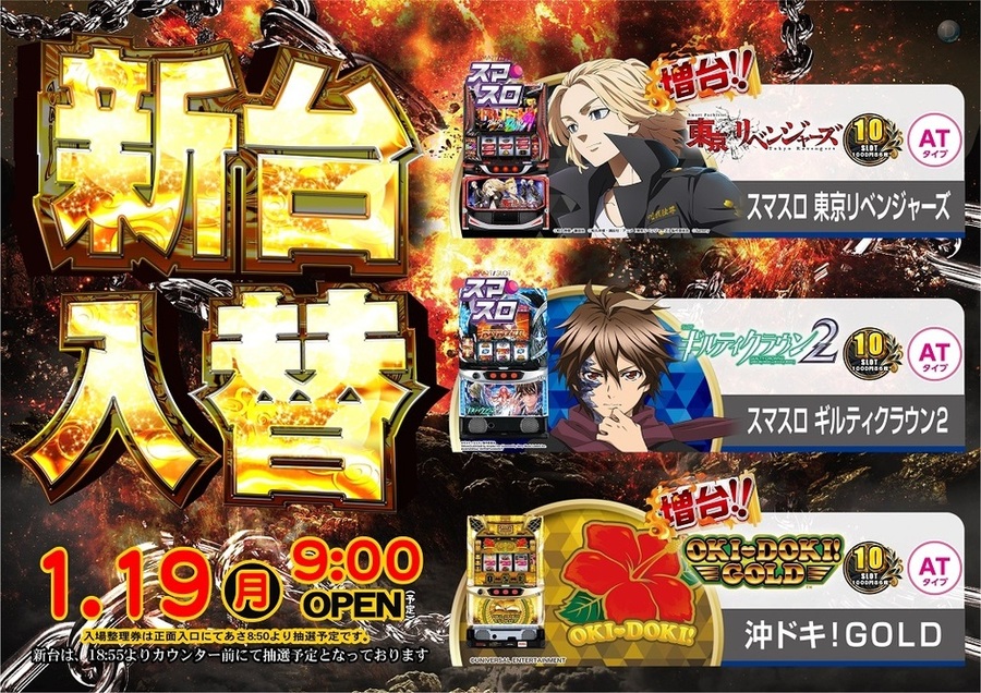 1月19日(月)9:00開店(予定) 新台入替(予定) のご案内です 一般入場整理券はあさ8:45より正面入り口にて配布予定です 新台につきましては、18:55よりカウンター前にて抽選予定です。(^^♪
