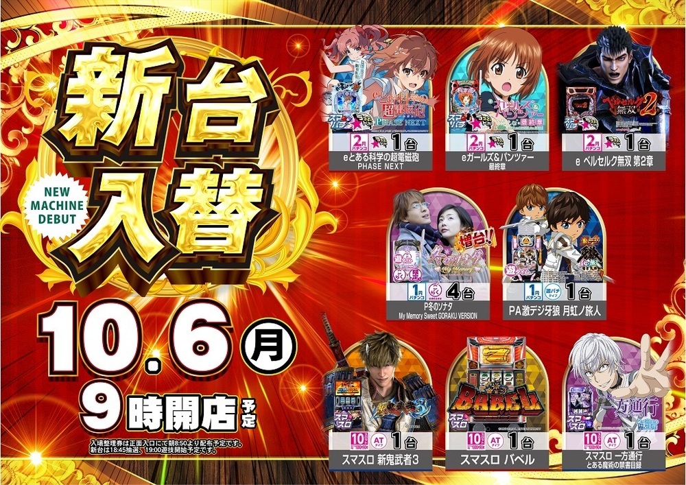 10月6日(月)新台入替(予定)