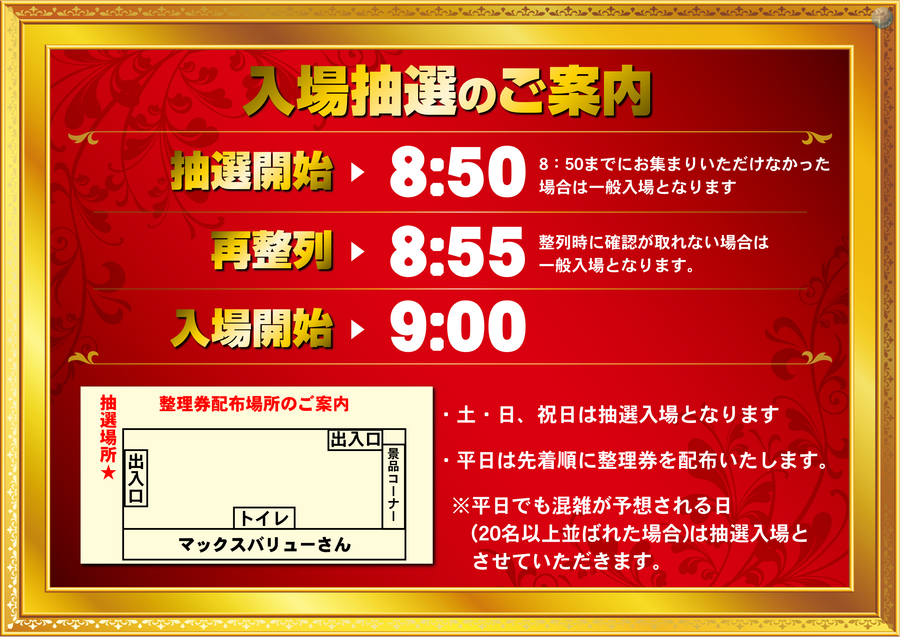 (20名以上並ばれた場合)は抽選入場とさせていただきます。ご了承くださいませ