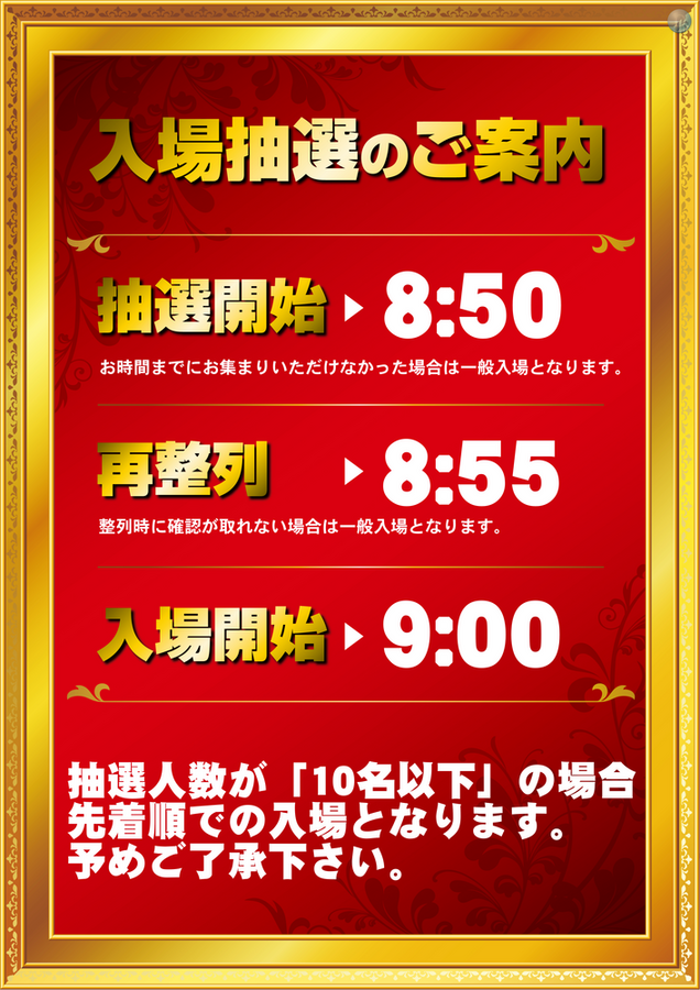 なお、抽選人数が『10人以下』の場合は先着順での入場となりますのでご了承ください