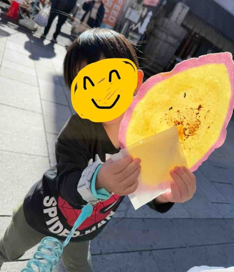 こどもたちは大きなおさつせんべいに