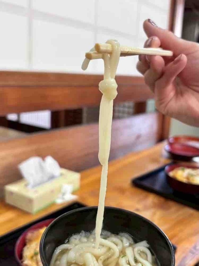 かつ丼の前にとりあえずうどんからという事で妻が麺を持ち上げてみたら・・・