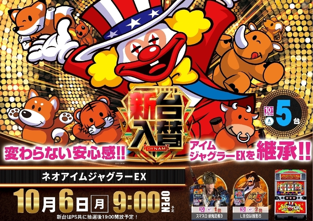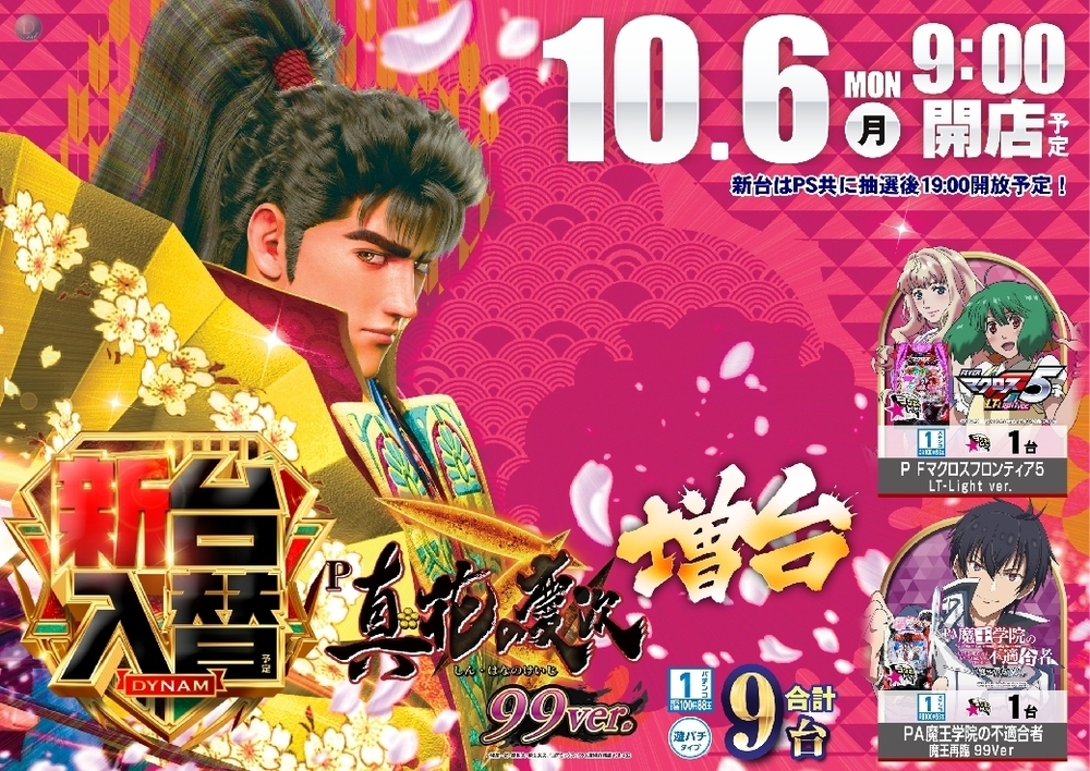 新台はPS共に19:00開放となります。 また、開放時間に新台をご遊技希望のお客様へは 抽選会を実施します あらかじめ、ご了承くださいませ