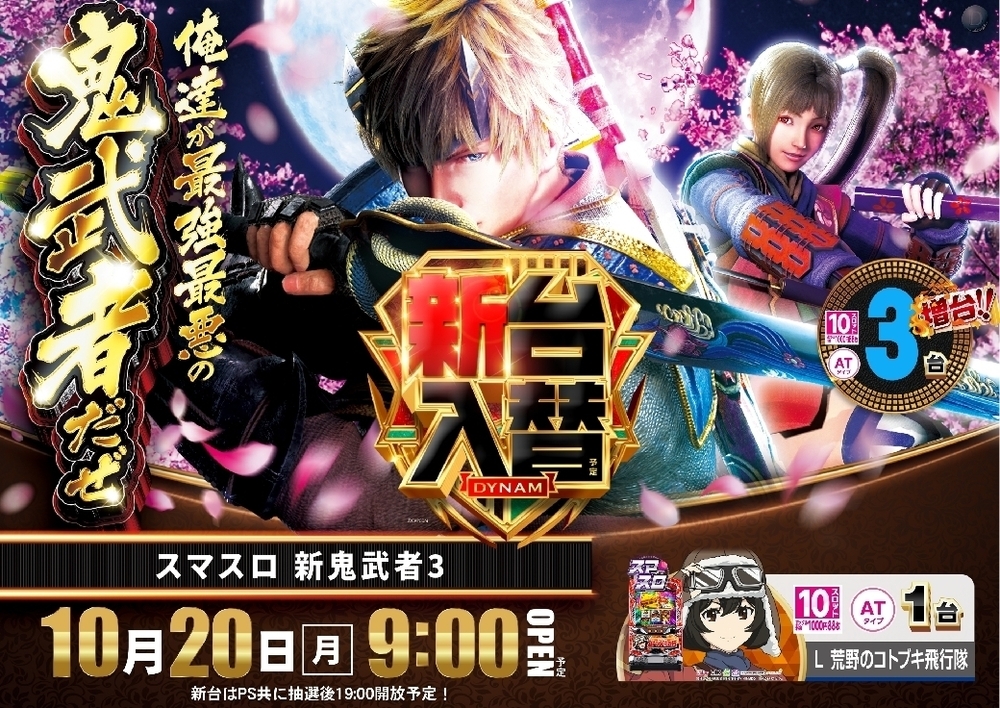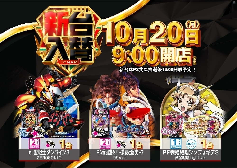 新台はPS共に19:00開放となります。 また、開放時間に新台をご遊技希望のお客様へは 抽選会を実施します あらかじめ、ご了承くださいませ