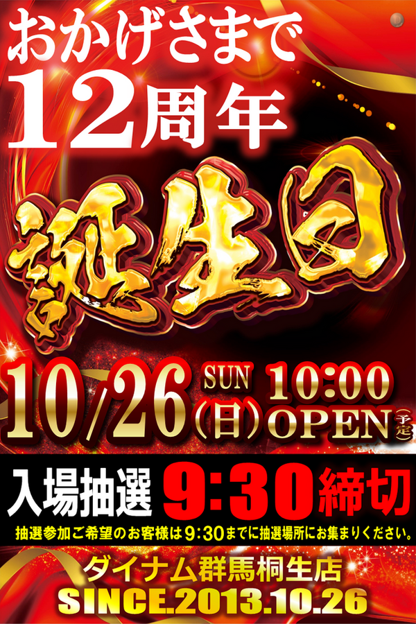 おかげさまでダイナム群馬桐生店は10月26日で誕生12周年を迎えます。