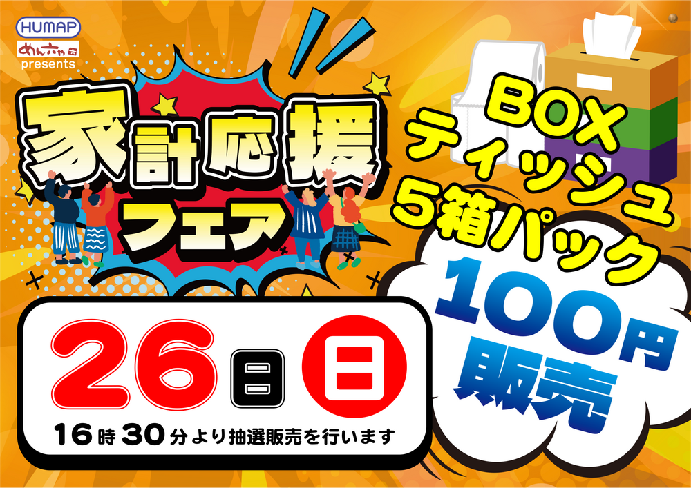 「家計応援フェア」 ★BOXティッシュ100円販売★ 販売16:30~(予定) ★ー★ー★━★ー★ー★