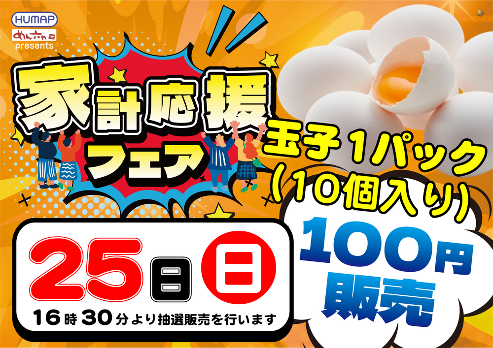 「家計応援フェア」 ★たまご1パック100円販売★ 販売16:30~(予定) ★ー★ー★━★ー★ー★