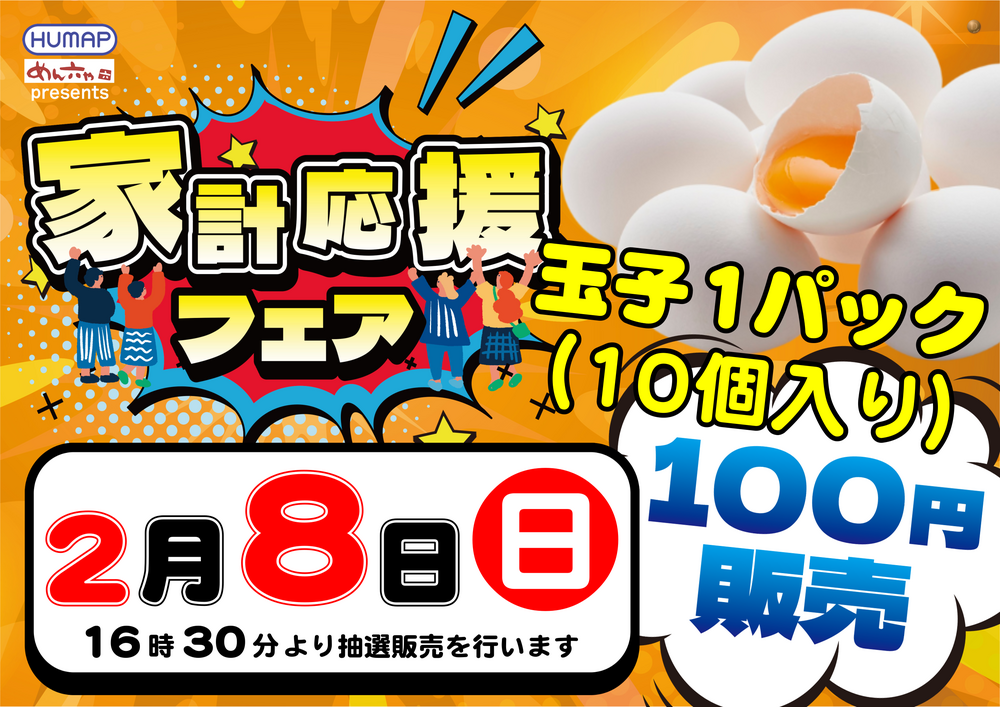 「家計応援フェア」 ★たまご1パック100円販売★ 販売16:30~(予定) ★ー★ー★━★ー★ー★